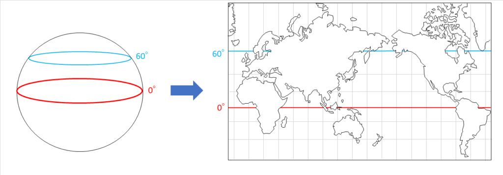 赤道は一周4万㎞ですが、緯度60°では2万㎞になります。