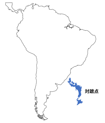 このように地球の裏側になる地点を対蹠点といって、東京の対蹠点はアルゼンチン沖になります。
